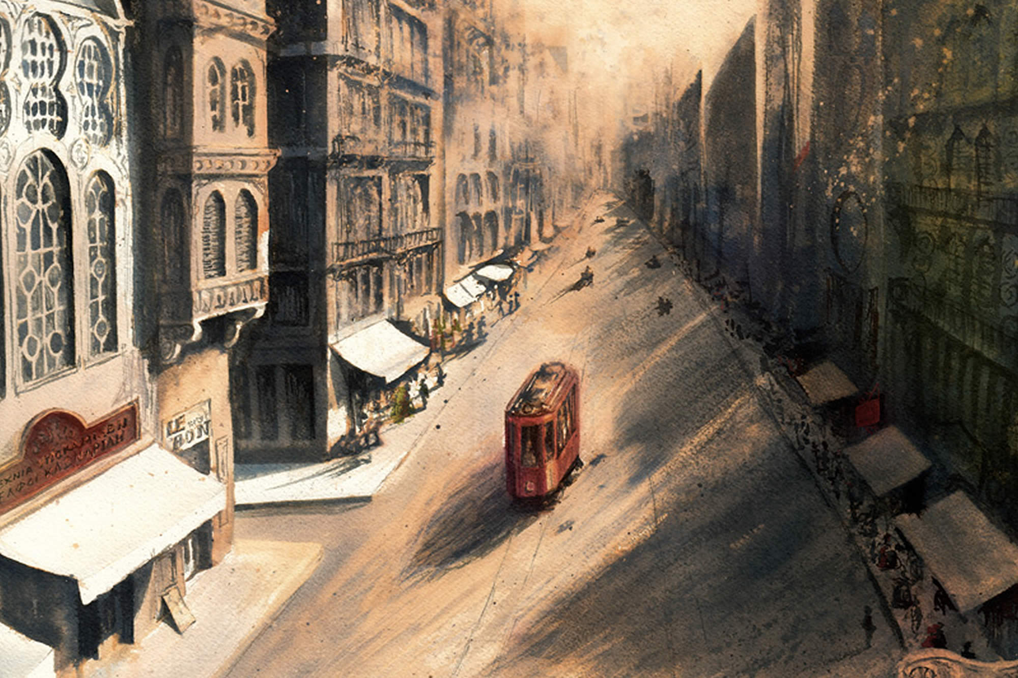 The tour starts out in 220 AD at the emblematic Column of the Goths (the oldest preserved monument in the city) and goes up to the 1920s and the “new” bridge at Galatas, unfolding 1,700 years of history through images of the Column of Constantine, the Aqueduct of Valens, the Basilica Cistern, the Monastery of Saint John of the Studium, Hagia Sophia, the church of Panagia Mouchliotissa (St. Mary of the Mongols), the Tower of Leander, the church of Christ Pantepoptes, the Palace of Bucoleon, the Monastery of the Pantokrator, the tower of Galata, the castle of the Bosphorus, the Suleymaniye Mosque, the spice market, the Caravanserai of the Validé, the Fountain of Mehmet Emin Aga, the Ortaköy Mosque, and the Great School of the Nation, the Camondo stairs and the great boulevard of the Peran and more.